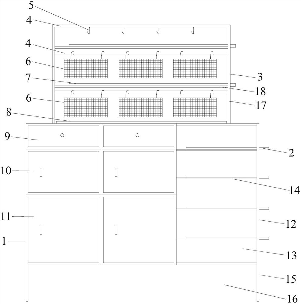| 摘要: | 本实用新型公开了阳台晾晒储物不锈钢一体柜,包括柜体,所述柜体的右侧有呈上下间隔分布的朝右推拉的多个无孔晾晒板,柜体的顶面有均沿柜体左右方向且呈前后布置的两个架体,各架体上有上下间隔分布的多个挂杆,位于最上方的挂杆上有多个挂钩,位于下方的其余挂杆上挂有可取下的多个置物框,两个架体上的挂钩和置物框反向布置,两个架体之间有朝右推拉的多个有孔晾晒板,柜体的顶面在最下方的挂杆的下方及最下方的孔晾晒板的下方有可取出的一接水盘,柜体、无孔晾晒板、架体、挂杆、挂钩、置物框、有孔晾晒板和接水盘均由不锈钢材质制成。本实用新型的阳台晾晒储物不锈钢一体柜耐用,能充分利用空间分类晾晒更多物品,可避免地面湿滑。 | ||||