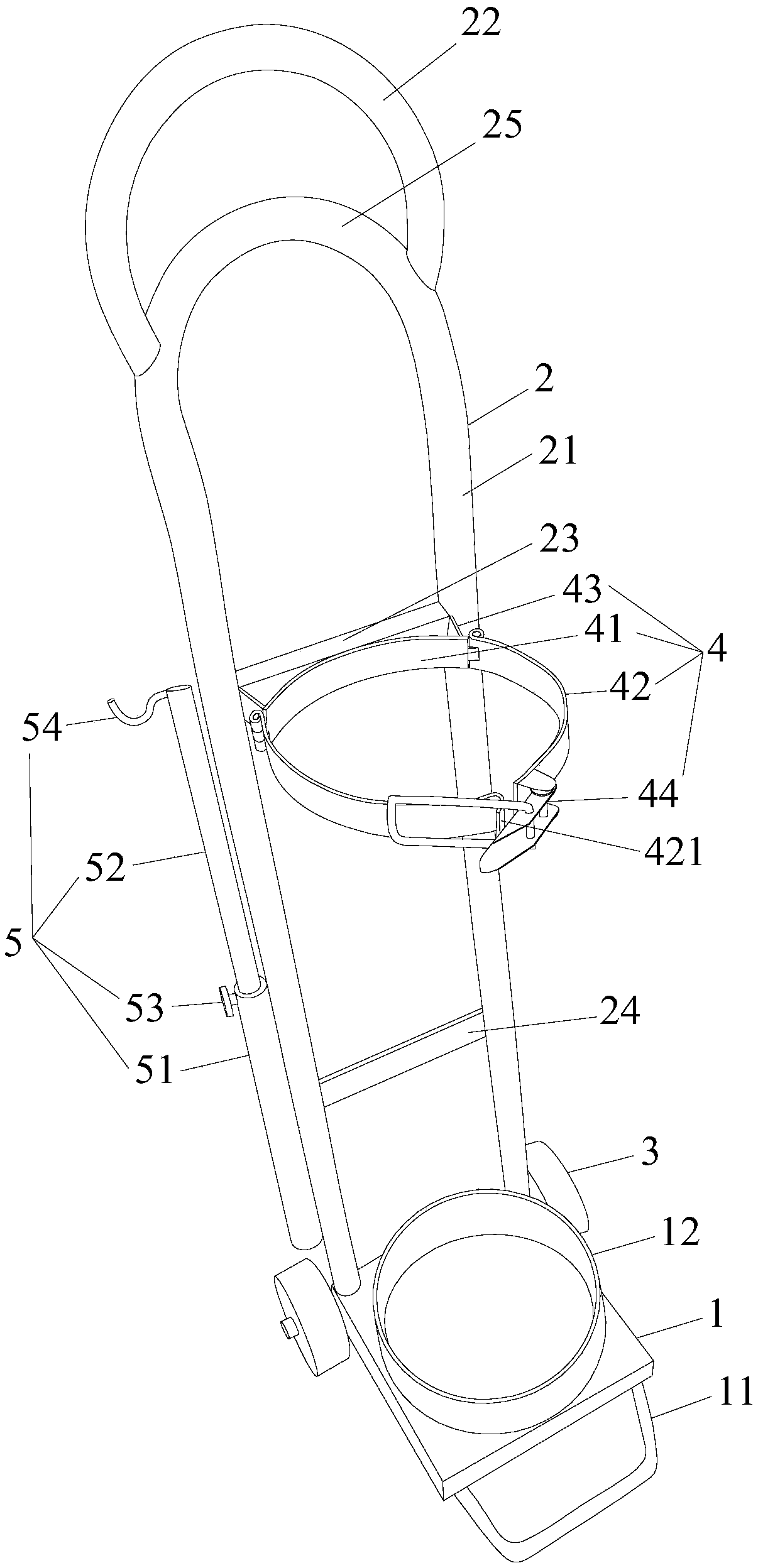 | 摘要: | 本实用新型公开了一种新生儿外出检查用氧气罐运输车,包括底座和立式车架,底座装有车轮,立式车架包括两条平行的立柱,两条立柱的下端固定在底座上,两条立柱的上端连接有把手,两条立柱的中部安装有氧气罐固定件,底座上还安装有位于两条立柱后的氧气管挂杆,氧气罐固定件包括一个弧形固定部和两个弧形活动部,弧形固定部的两端分别固定在两条立柱上,弧形固定部的两端还分别与两个弧形活动部的一端铰接连接,两个弧形活动部的另一端通过搭扣可拆卸连接,两个弧形活动部通过搭扣连接后与弧形固定部构成用于固定氧气罐的圆形固定环。本实用新型的新生儿外出检查用氧气罐运输车避免来回搬动氧气罐,节约了医护人员的宝贵时间。 | ||||