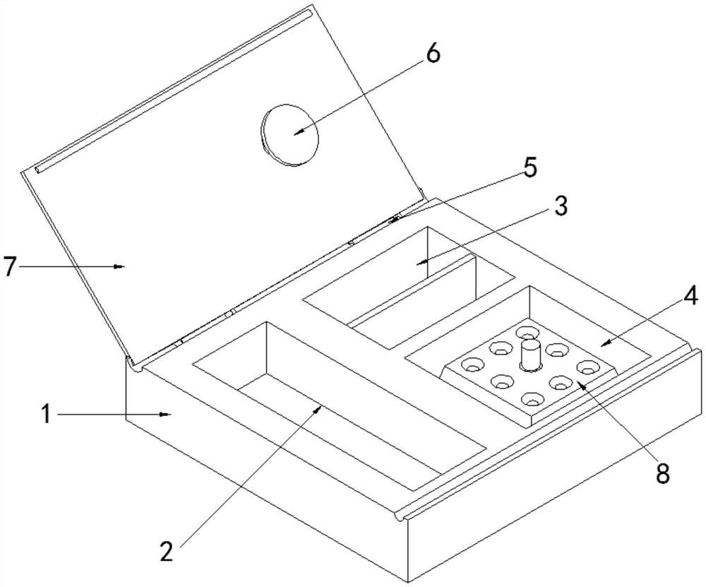 | 摘要: | 本实用新型涉及医疗设备技术领域,且公开了一种医用护理盘,包括盘体,所述盘体顶部开设有器械槽,所述顶部开设有分级槽,所述盘体顶部开设有插槽,所述插槽底部开设有磁制卡块,所述插槽中部内壁卡接有药物架,所述盘体中部内壁活动连接有铰接轴,所述铰接轴外侧固定连接有盘盖,所述盘盖背面固定连接有压块,所述药物架中部内壁固定连接有插筒,所述插筒内侧固定连接有轴座,所述轴座顶部活动连接有活动杆。该医用护理盘通过弧形夹板带动活动杆运动,活动杆带动弹簧柱运动,再通过轴座与插筒的配合使用,从而达到操作简单,便于拿取防止药瓶松动倾倒的效果,与传统设备相比较该医疗盘能够有效的保证药瓶的运输稳定性。 | ||||