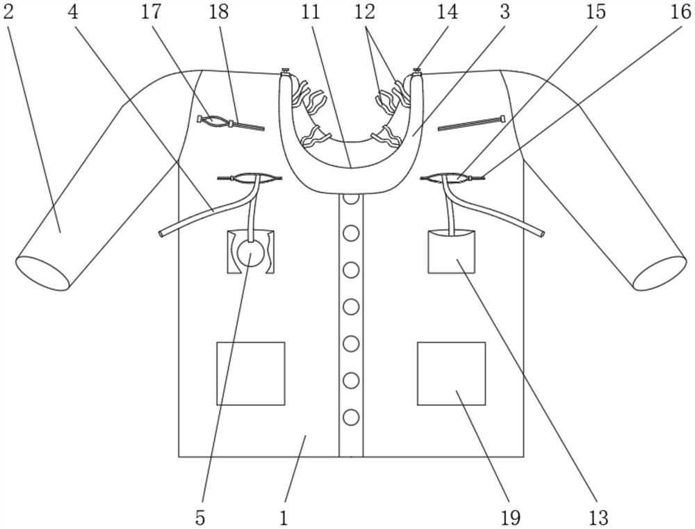 | 摘要: | 本实用新型公开了一种喉癌手术患者多功能病号服。一种喉癌手术患者多功能病号服,包括衣服本体和衣袖,其中,所述衣服本体的领口两侧设有能够固定管道的固定带,在对应患者前胸部位的所述领口上可拆卸装设有防护垫,在靠近该防护垫底部的衣服本体两侧设有能够供引流管通过的可开闭引流口结构,在所述引流管上设有引流球,在可开闭引流口结构正下方的衣服本体上设有能够收纳引流球的收纳袋。本实用新型一种喉癌手术患者多功能病号服,使用简单方便,固定管道效果好并且能够提高患者的舒适感。 | ||||