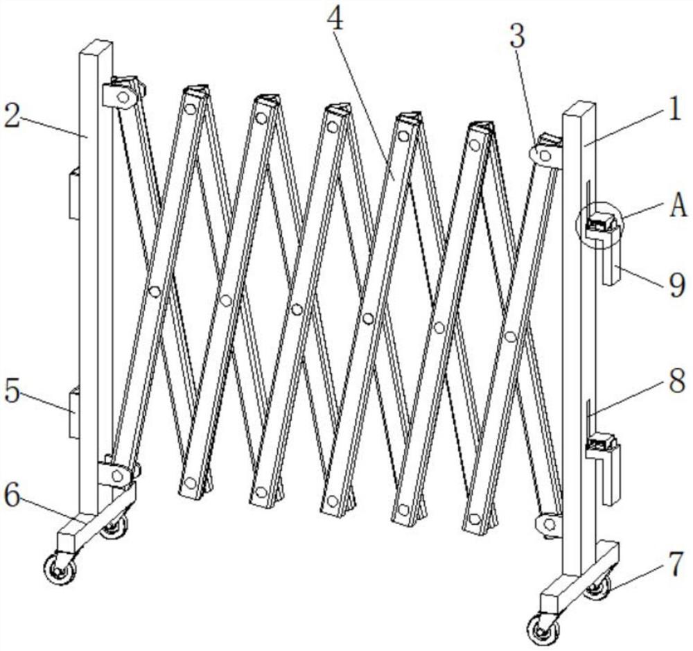 | 摘要: | 本实用新型公开了一种可移动伸缩防护栏,包括立柱一和立柱二,所述立柱二并排设置于立柱一的左侧,所述立柱一与立柱二的底部均固定连接有底柱,所述底柱底部的前后两侧均固定连接有万向轮,所述立柱二左侧的顶部与底部均固定连接有卡槽,立柱二右侧的顶部与底部和立柱一左侧的顶部与底部均固定连接有连接件。本实用新型通过立柱一、立柱二、连接件、伸缩组件、卡槽、底柱、万向轮、移动槽、卡扣、外壳、弹簧、固定板二、卡板、限位架、固定板一、移动块和卡槽的配合使用,解决了传统的可移动式防护栏杆底部没有滚轮,移动不方便,也不能折叠,占用空间比较大,同时,在使用的过程中不方便对多个防护栏进行连接的问题。 | ||||