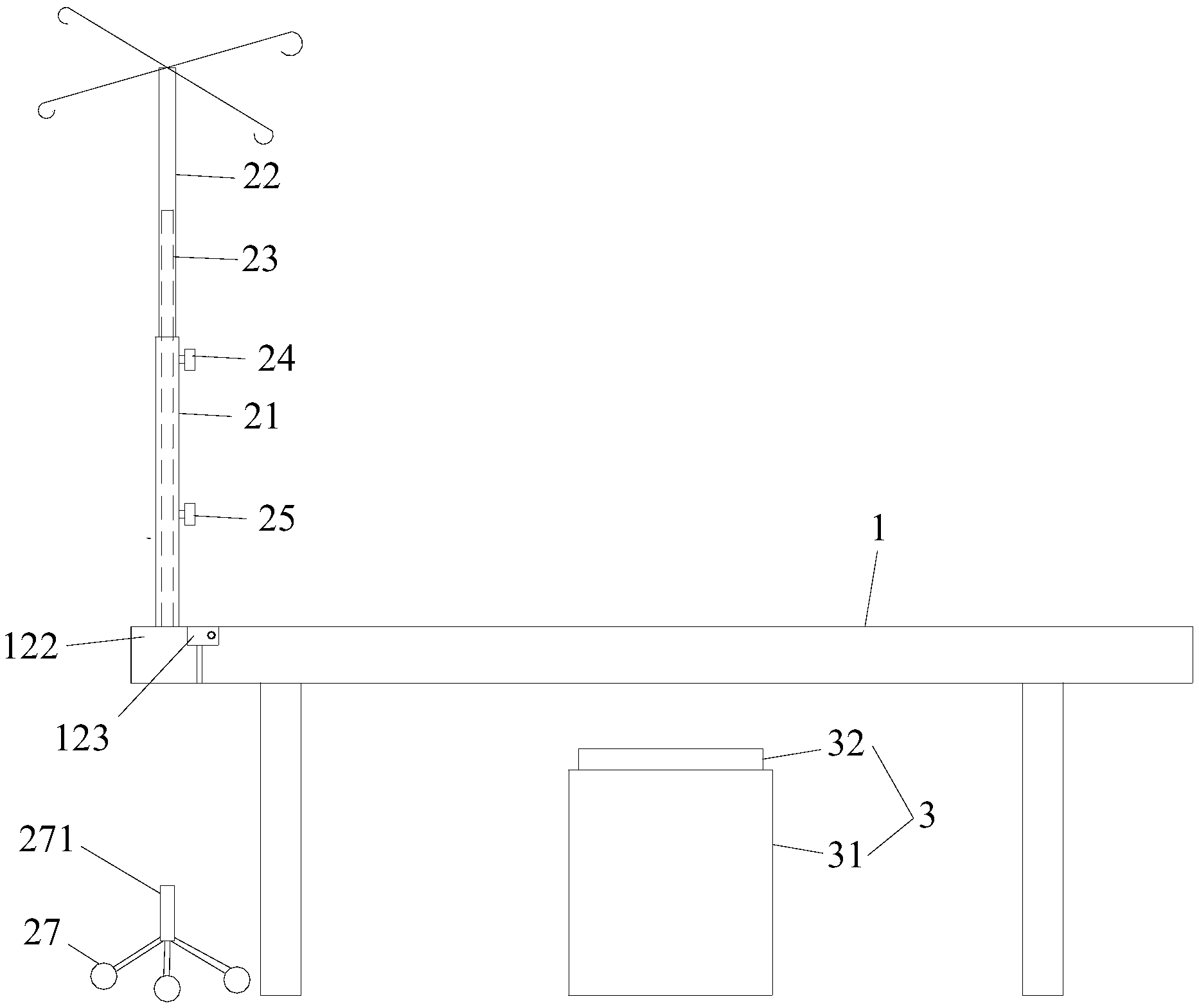 | 摘要: | 本实用新型公开了一种输液架床,包括床、输液架和落地便桶;床上有沿着床的四边布置的连续的轨道,床头的其中一个角落开有外侧可打开的通孔,床的中部开有便孔并且在便孔处盖有可打开的盖体;输液架包括主套管、带有挂钩的上伸缩管、以及下伸缩管,主套管的上中下三个位置分别装有上伸缩调节旋钮、下伸缩调节旋钮和沿轨道滑行的滑轮,上伸缩管的下端套入主套管内并且通过上伸缩调节旋钮固定,下伸缩管的上端套入主套管和上伸缩管内并且通过下伸缩调节旋钮固定,输液架还包括与通孔对应的可与下伸缩管的下端连接和分离的三角落地滑轮;落地便桶位于床下正对便孔。本实用新型的输液架床方便卧床病人床上大小便,也方便非卧床病人外出或者上厕所。 | ||||