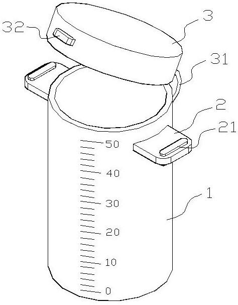 | 摘要: | 本实用新型涉及头颈部伤口引流领域,尤其涉及一种一次性头颈部伤口引流液测量杯,该测量杯可直接对每天的引流液进行盛接和单独测量,准确且操作简单,且避免外溢,有效解决背景技术中提出的问题。包括上开口且透明的圆柱筒,圆柱筒外侧面设有刻度和数字,所述圆柱筒上开口处设有可翻盖的上盖;所述圆柱筒上端部外侧面左右对称固定设有横向的把手。上盖呈下开口的圆柱筒状,套设在圆柱筒外侧,且上盖一侧外表面与圆柱筒外表面之间固定设有柔性连接部。上盖中心位置嵌有圆孔,圆孔内侧面设有圆形可封堵圆孔的硅胶垫,硅胶垫底面与上盖内顶面之间固定设有供硅胶垫朝圆孔贴合的弹性压紧件。它操作简单,使用方便,适用于多种患者。 | ||||