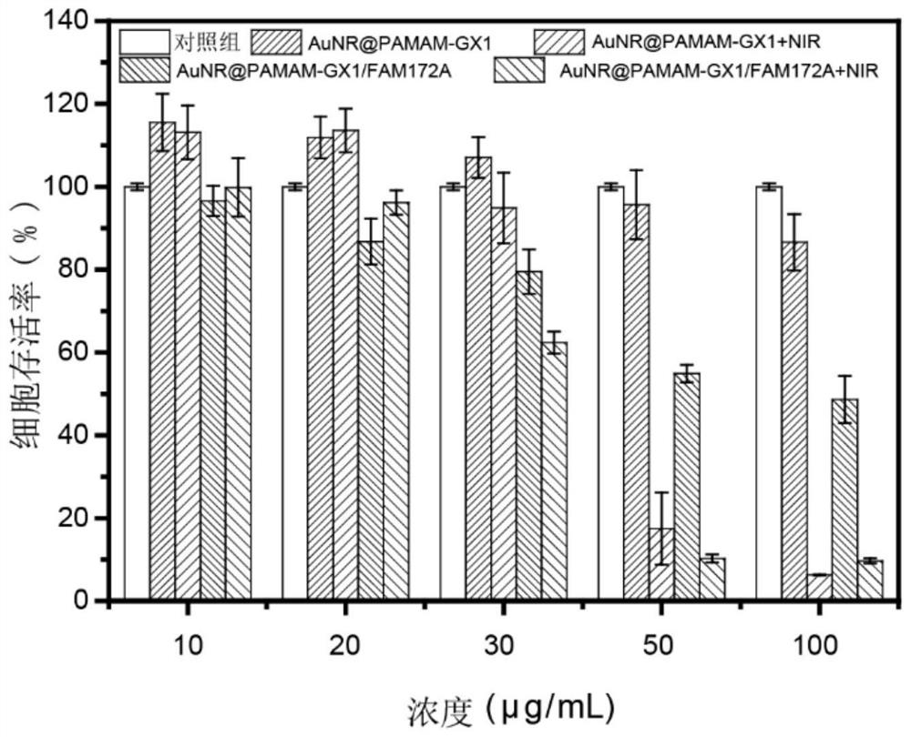 | 摘要: | 本发明涉及纳米材料技术领域,尤其涉及一种纳米材料及其应用。本发明的纳米材料,包括纳米金棒AuNR、树枝状大分子聚氨基胺PAMAM、靶向多肽GX1和siRNA FAM172A。本发明通过制备金纳米棒,PAMAM分子进行巯基化改性,取代掉金纳米棒表面的CTAB分子,将金纳米棒包裹,同时,通过酰胺化反应,将PAMAM与靶向多肽GX1连接,PAMAM再通过正负电荷相互吸引与FAM172A结合(PAMAM带正电,FAM172A带负电),整体形成纳米体系AuNR@PAMAM‑GX1/FAM172A,可有效靶向肠癌,通过光热/基因双重影响,达到治疗效果。 | ||||
