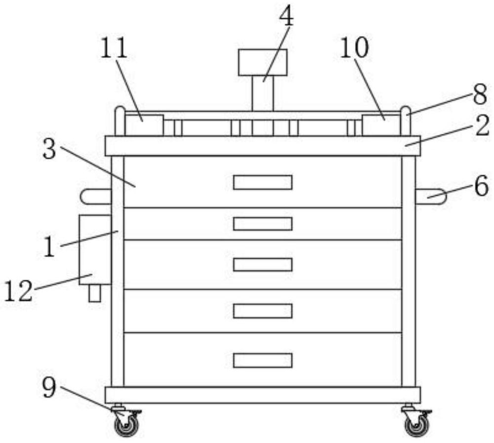 | 摘要: | 本实用新型公开了一种医用复合式多功能麻醉车,包括麻醉车主体,所述麻醉车主体的顶部设置有工作台,所述工作台顶部的后侧设置有弧形架,所述麻醉车主体的正面从上至下依次设置有收纳抽屉,所述麻醉车主体背面的顶部设置有电脑支撑杆,所述电脑支撑杆的两侧均设置有多功能插座固定架,所述多功能插座固定架的正面与麻醉车主体背面两侧的顶部连接,所述麻醉车主体两侧的顶部均设置有扶手。本实用新型通过设置麻醉车主体、工作台、收纳抽屉、电脑支撑杆、多功能插座固定架、扶手、胶带存放架、弧形架、脚轮、药品警示标识存放架、锐器收集盒和自动感应式消毒器的相互配合,达到了多功能的优点,可以满足使用者的需求。 | ||||