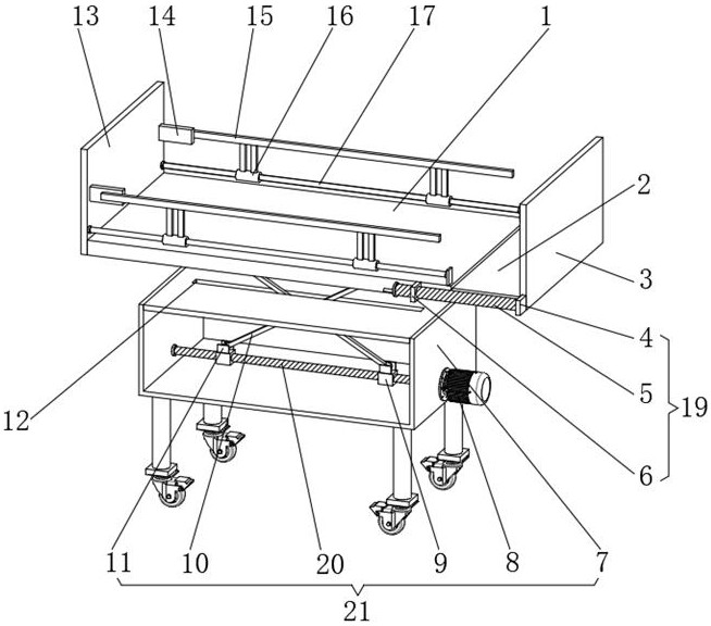 | 摘要: | 本实用新型公开了一种医用推车,包括车体,所述车体的底部设置有驱动机构,驱动机构包括底壳,底壳底部有带万向轮的支撑腿,底壳的内腔两侧活动安装有螺纹轴,底壳的外侧有伺服电机,伺服电机的输出端伸入底壳的内腔与螺纹轴的一端连接,螺纹轴上通过螺纹套连接有剪刀式的活动连接杆,活动连接杆的上端贯穿伸出底壳的顶壁外并且与车体底部通过导向滑轨活动连接。本实用新型便于对设备的高度进行调节,使得其在某些需要调节高度的场合,不影响转运效率。 | ||||