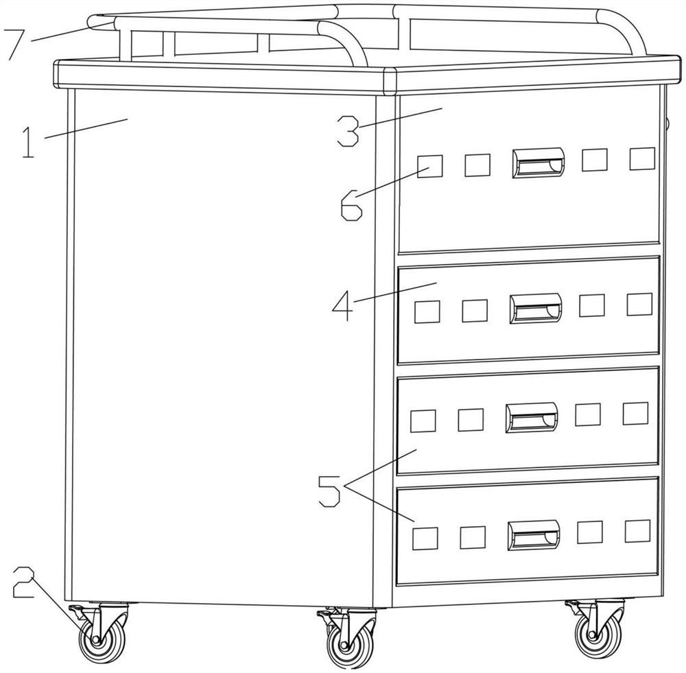 | 摘要: | 一种便于分类存取临床药品的药品储存柜,所述药品储存柜包括储存柜主体和自锁滚轮,所述自锁滚轮固定在储存柜主体的底部;所述储存柜主体包括上层储药层、中层储药层、下层储药层;所述上层储药层内部可拆卸连接有若干第一分隔板,所述上层储药层被若干第一分隔板划分为多个存取药格;所述中层储药层内部可拆卸连接有分区板,所述中层储药层被分区板划分为药品存放格和药品收纳格;所述下层储药层内部可拆卸连接有若干第三分隔板,所述下层储药层被若干第三分隔板划分为多个低温药剂存放格,所述若干第三分隔板均为塑性海绵板。通过本实用新型的储存柜主体可以对药品、药剂进行分类、还能自由调节药品存放空间大小。 | ||||