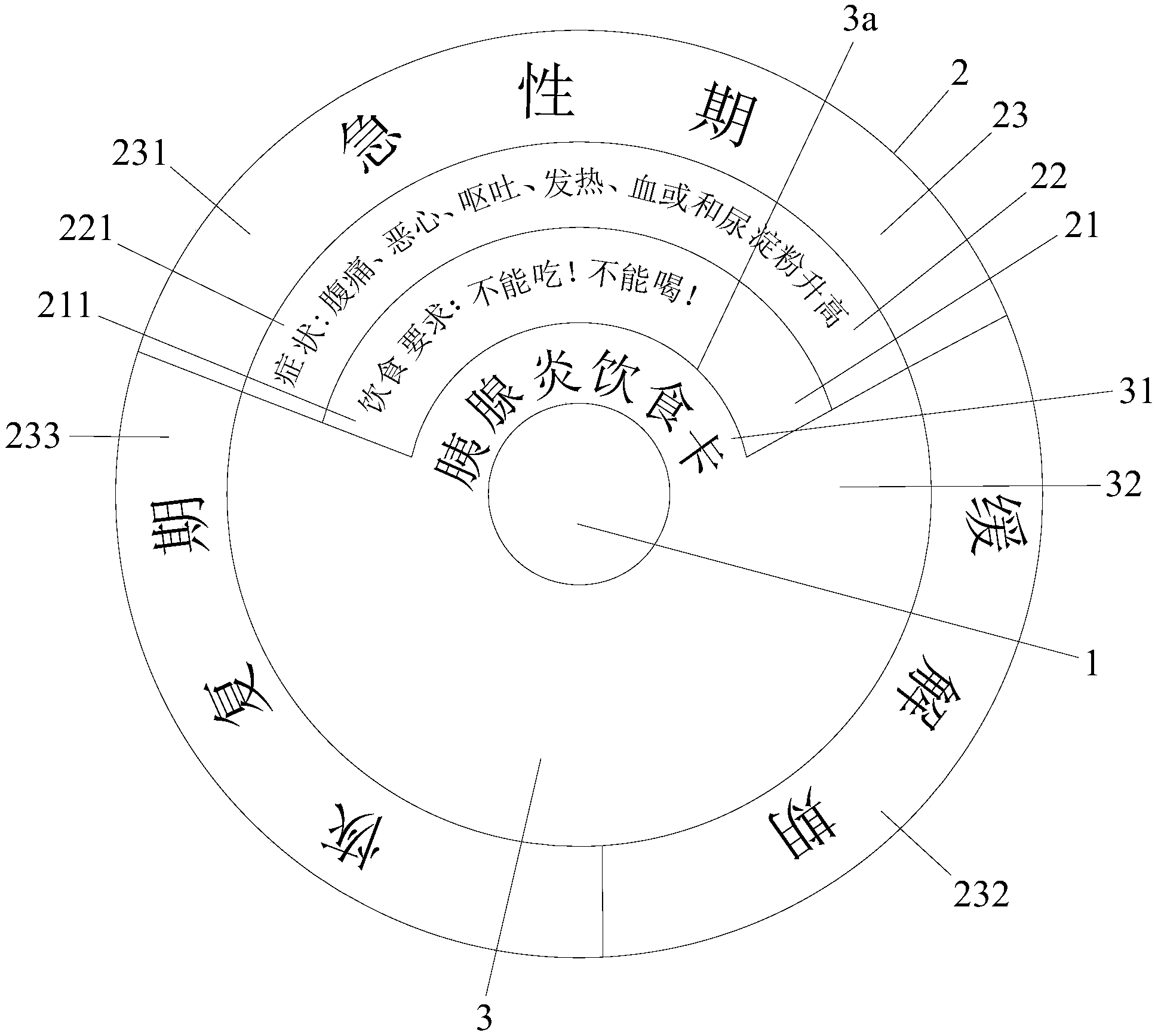 | 摘要: | 本实用新型公开了一种胰腺炎患者饮食转盘,包括主轴、以及装于主轴上并且呈前后分布的固定盘和转盘;固定盘上开有缺口;转盘包括由内到外依次分布的内环区、中间环区和外环区,外环区位于固定盘的外边缘外侧,外环区等份分为急性期区、缓解期区和恢复期区三个区域,中间环区的外边缘与固定盘的外边缘平齐,中间环区等份分为分别与急性期区、缓解期区、恢复期区对应的三个症状描述区,内环区为等份分为分别与急性期区、缓解期区、恢复期区对应的三个饮食要求区,缺口在转盘转动时能分别暴露与急性期区、缓解期区、恢复期区对应的症状描述区和饮食要求区。本实用新型的胰腺炎患者饮食转盘方便胰腺炎患者随时能熟知自己的病情和饮食原则。 | ||||
