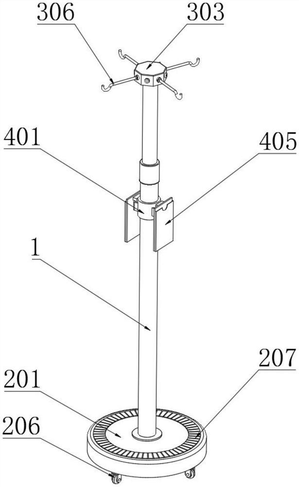 | 摘要: | 本实用新型公开了一种病房护理用输液架,包括输液架主体,所述输液架主体底端固定连接有圆形的安装底座,所述安装底座底端圆周方向均匀固定连接有矩形的容纳槽,所述安装底座底端对应容纳槽中部位置处贯穿开设有弧形槽,所述容纳槽内侧一端通过转轴转动连接有摆动连杆,本实用新型通过转动驱动环带动弧形挡块在弧形槽内部进行转动,通过弧形挡块对摆动连杆进行限位,从而防止摆动连杆在输液架移动过程中出现偏转的现象,通过连接架和滚动轮使输液架移动的更加便捷,通过对输液架的可变形设计,使输液架在放置过程中更加平稳,同时也使其在移动过程中移动的更加便捷,从而有效的提高了输液架的使用性能。 | ||||