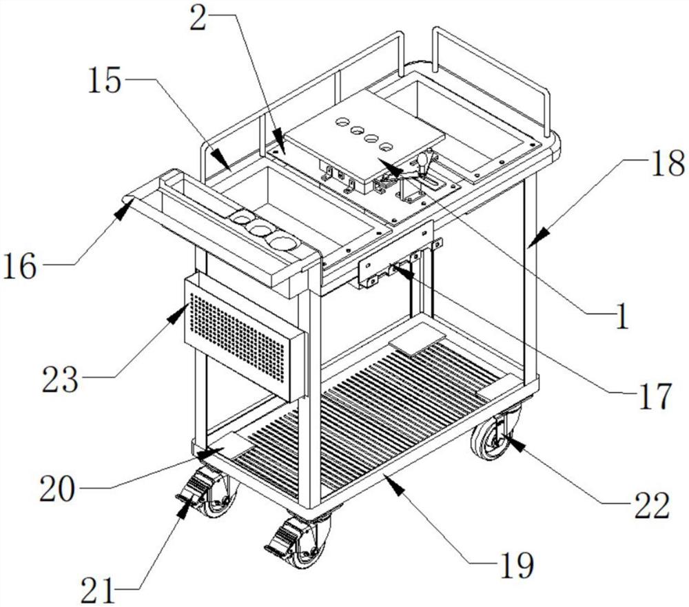 | 摘要: | 本实用新型公开了一种医疗垃圾回收处理推车,包括垃圾箱主体,垃圾箱主体包括环氧板,环氧板的内部贯穿设置有箱子,环氧板的顶部表面安装有架子,架子的顶部表面依次安装有第一连杆、第二连杆和把手,箱子的顶端表面设置有梯形板,梯形板的顶部表面安装有注射器放置板,梯形板的一侧贯穿设置有第一活动板和第二活动板,梯形板的四周均安装有角马和固定件,箱子的底部设置有储物箱。本实用新型是一种医疗垃圾回收处理推车,该推车具有独立的切断机构,护士可仅通过拉动把手进行输液器和针头的分离,减少了护士的工作量,同时可以高效的进行分离,在输液器和针头分离后,针头会掉入底部的收集盒中,降低了感染传播的概率。 | ||||