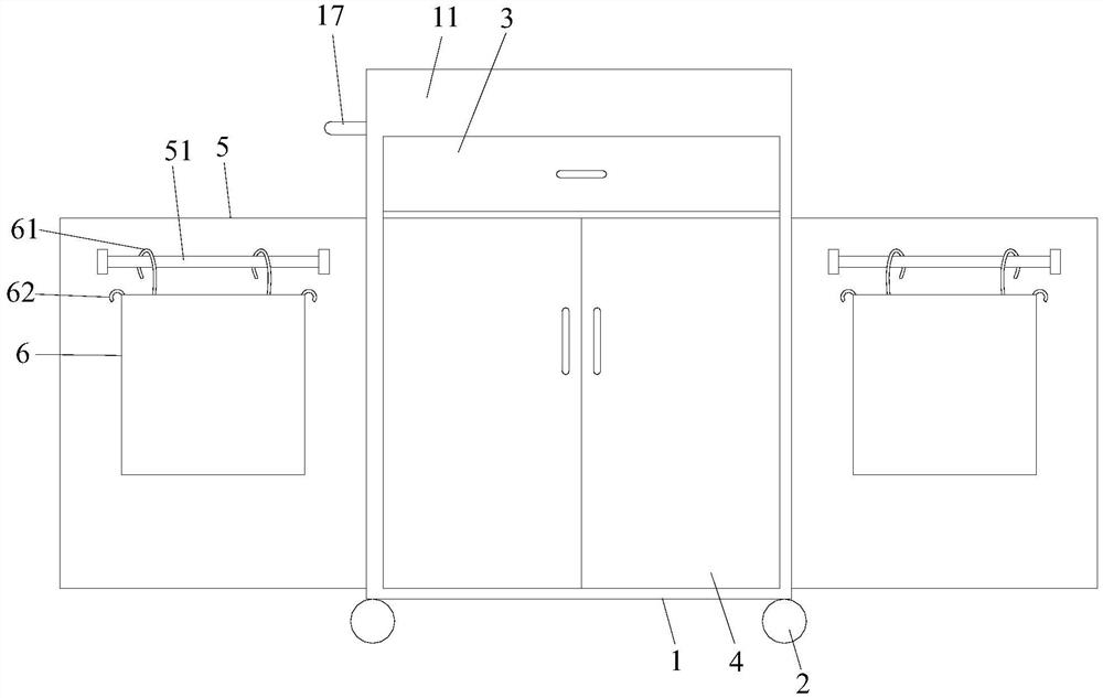 | 摘要: | 本实用新型公开了一种带可移动医用垃圾筐的换药车,包括车体,车体底部装有万向轮,所述车体包括上腔和下腔,上腔的前侧敞口,下腔的前侧、左侧和右侧均敞口,上腔内装有用于放置消毒换药包且沿前后方向推拉的抽屉,下腔的前侧敞口处装有对开式的开关门一,所述下腔的左侧和右侧敞口处均装有开关门二,开关门二的后侧与车体铰接连接,开关门二的内侧固定有横向挂杆,横向挂杆上挂有可取下的套袋式垃圾筐。本实用新型的带可移动医用垃圾筐的换药车方便了医用垃圾的丢弃。 | ||||