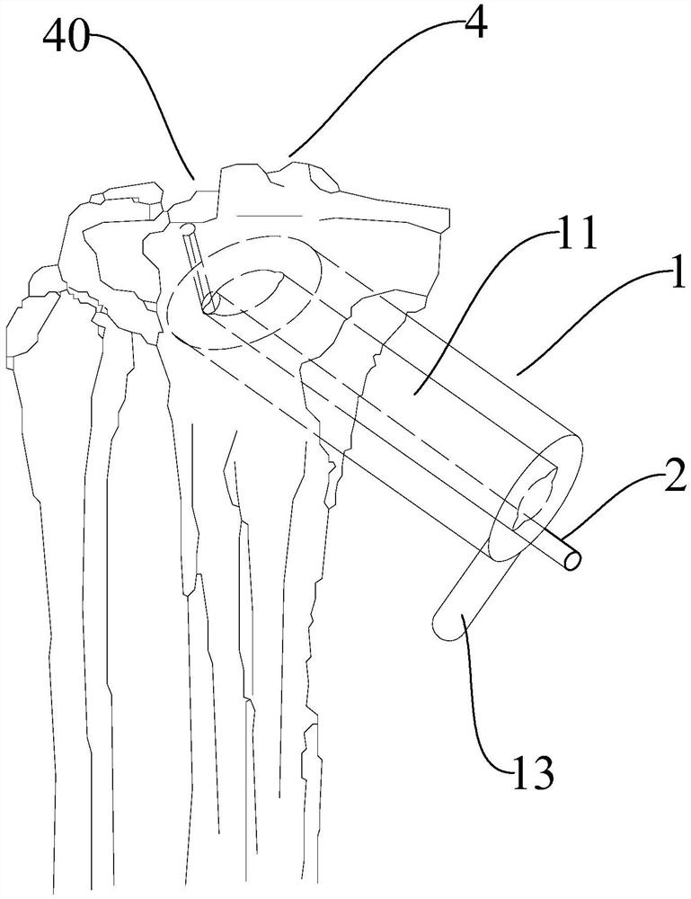 | 摘要: | 本实用新型公开了一种胫骨平台复位装置,包括套筒、复位顶杆和植骨顶杆,套筒内部具有植骨通道和凹槽,复位顶杆能够伸入凹槽内部并延伸至胫骨平台的塌陷处,植骨顶杆能够在植骨通道内运动。在使用过程中,将套筒伸入胫骨平台,然后将复位顶杆从套筒内部的凹槽中伸入,使复位顶杆的顶部顶到胫骨平台的塌陷处将塌陷处顶至复位,拔出复位顶杆,在植骨通道中充入填充材料,将植骨顶杆插入植骨通道,推动植骨顶杆将填充材料推至塌陷处的下方,用以填充塌陷处所压陷的空间,这种胫骨平台复位装置能够有效减少骨折部位的暴露区域,降低手术过程中对患者的二次损伤。 | ||||