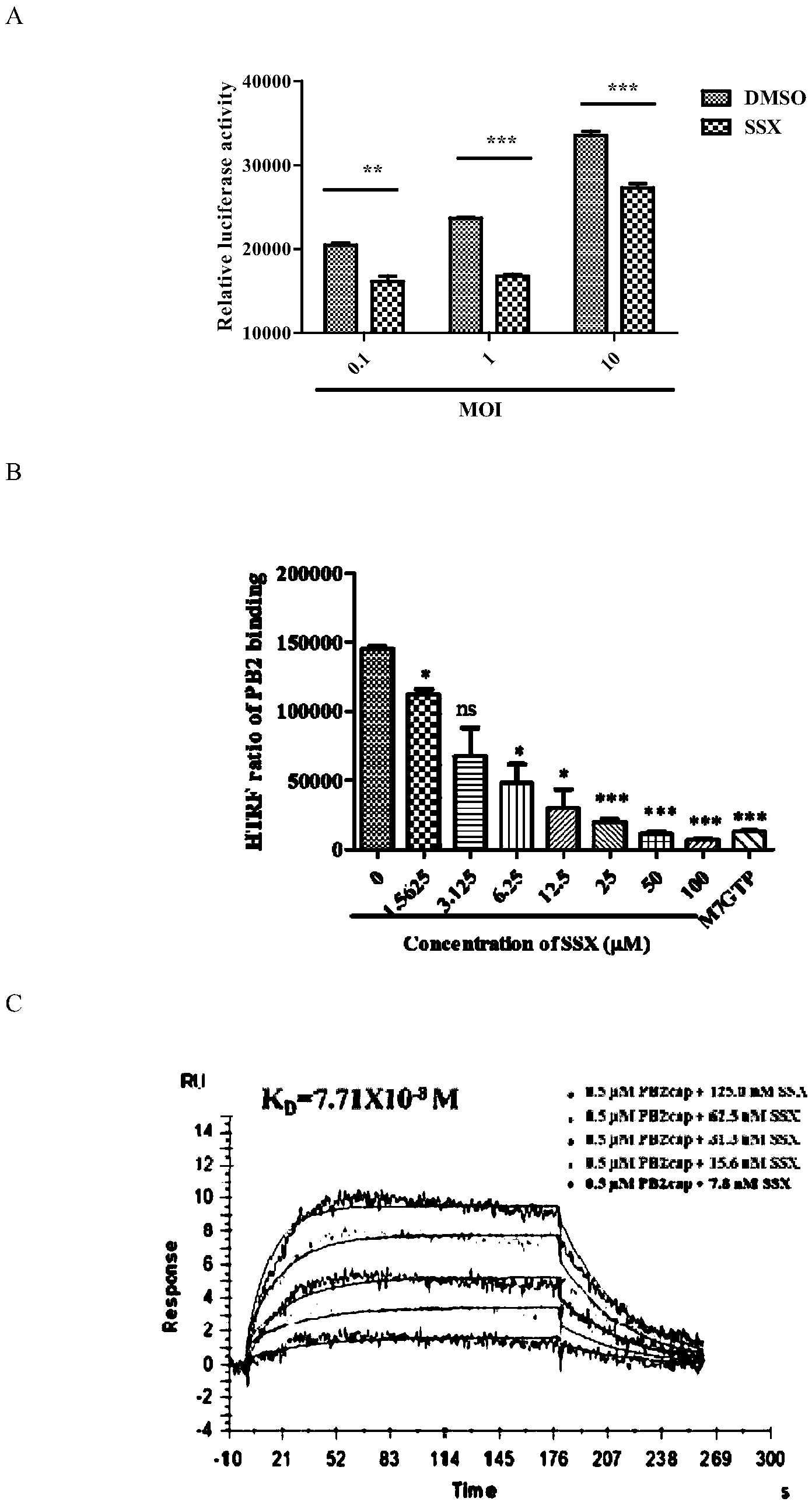 | 摘要: | 本发明公开了螺圆孢菌素X在制备治疗甲型流感药物中的应用。所述流感病毒为甲型流感病毒,优选为H1N1、H3N2、H5N1或H7N9。所述螺圆饱菌素X抗甲型流感病毒中的作用机制是通过与PB2cap蛋白的结合抑制核糖核蛋白复合物vRNP活性,制备用于预防和治疗流感的药物。其中,螺圆饱菌素X与流感病毒PB2cap蛋白结合的位点为355位的精氨酸(Arg355),429位的天冬酰胺(Asn429),339位的赖氨酸(Lys339),431位的甲硫氨酸(Met431),325位的苯丙氨酸(Phe325)。 | ||||