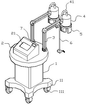 | 摘要: | 本实用新型涉及艾灸设备领域,尤其涉及一种改良艾灸仪,该艾灸仪设有遮挡艾灸罩灯光的结构,利于保护患者眼睛,有效解决背景技术中提出的问题。包括主体,主体底部设有底座,所述底座底部设有万向轮,所述主体顶部设有控制台,控制台上设有显示屏,控制台一侧设有可调节角度的支架,支架末端安装有艾灸罩,艾灸罩通过线路与控制台相连接,所述艾灸罩下端口呈圆形结构,且外部设有旋转的遮挡结构,遮挡结构包括周向旋转的套筒,所述套筒底面周向间隔固定设有大小不同的柔性的遮挡片,所述遮挡片内表面和外表面设有相互配合的粘扣带粘钩和粘扣带基座;艾灸罩一侧的支架上固定设有温度检测结构。它操作简单,使用方便,适用于多种场所。 | ||||