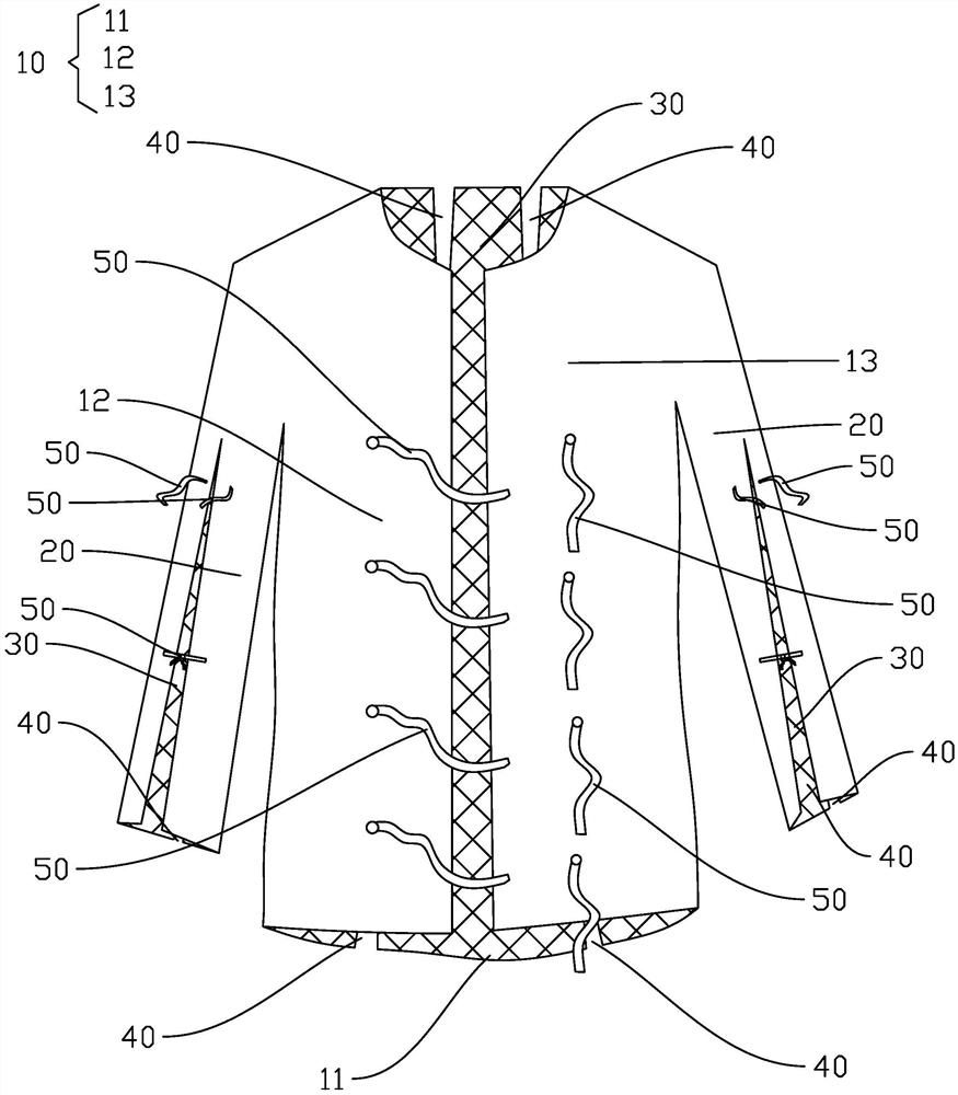 | 摘要: | 本实用新型公开了一种便捷式换药服,包括衣服本体和袖子,通过在衣服本体和袖子内侧设置有纱布层,在衣服本体和袖子上沿长度方向设置有至少一道缺口,在缺口两侧设置有至少两组绑带,在使用时,先将药粉或药水撒在纱布层上,然后让病人直接穿上换药服,由于缺口的存在,使得缺口两侧的布料是可以相互重叠的,然后通过绑带调节袖子以及衣服本体的大小,使纱布层紧贴合在病人的创面上,之后在衣服本体外侧以及袖子外侧可以通过纱布进行辅助包裹。相对于现有技术而言,更加省时省力,既减轻了医护人员的工作量,也降低了病人的疼痛时间。 | ||||