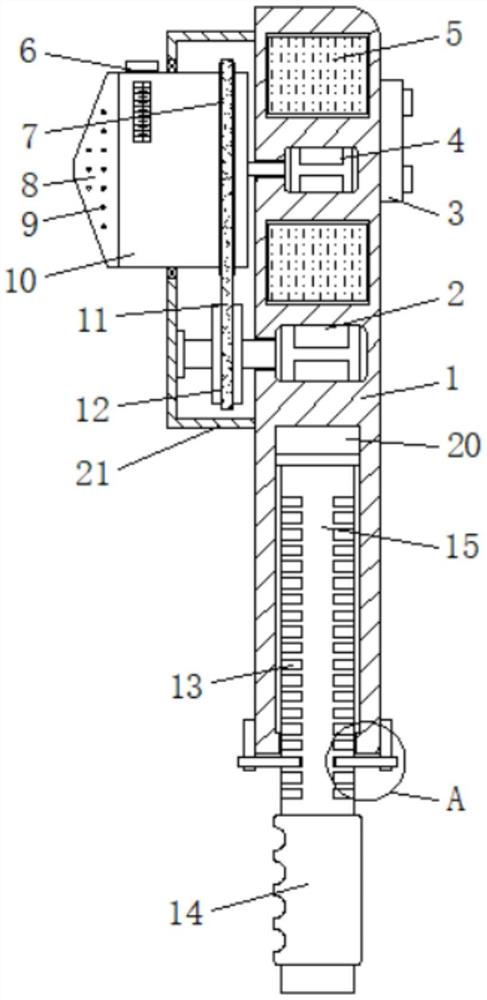 | 摘要: | 本实用新型公开了便携式药膏涂抹器,包括固定套,所述固定套右侧的顶部固定连接有时间控制器,所述固定套内部的顶部固定安装有供电电池,所述固定套内部的顶部固定安装有减速电机,减速电机的输出端固定连接有活动杆。本实用新型通过设置驱动电机、时间控制器、减速电机、供电电池、注料管、从动皮带轮、涂抹盘、微孔、储料壳、传动皮带、主动皮带轮、插槽、滑杆、螺旋叶片、活动杆、旋转挡板、固定底座和收纳槽配合使用,具有方便操作和调整长度的优点,解决了现有的药膏涂抹器需人工手动将药膏涂覆在器械上,不仅需要多次涂抹,且涂抹均匀性一般,同时无法调整拿持长度,适用范围较小,降低了药膏涂抹器实用性的问题。 | ||||