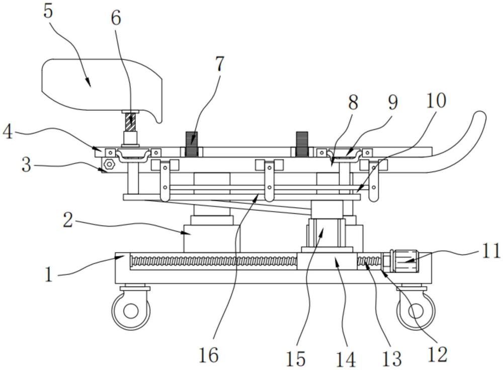 | 摘要: | 本实用新型公开了一种无痛后装转运床,包括底座、转运床板、活动床板、弹力绑带和支撑架,转运床板设置在底座的上方,活动床板设置在转运床板的顶端,活动床板的一端皆安装有支撑杆,且支撑杆的顶端安装有腿部支持块,活动床板一侧的外壁上皆安装有锁扣,弹力绑带皆安装在活动床板另一侧的外壁上,活动床板两侧的外壁上皆安装有拉手,底座的顶端皆安装有第一伸缩驱动件,底座顶部的两侧皆设置有导轨,且导轨的内部转动安装有丝杆,并且丝杆的外壁上套装有活动座,支撑架设置在丝杆的上方。本实用新型不仅可自动转移病人,操作方便省力,平稳可靠,而且具有安全防护措施,可防止病人坠床。 | ||||