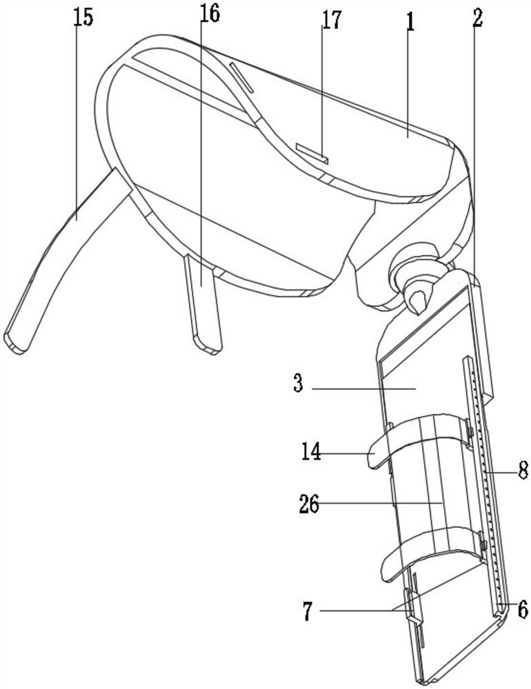 | 摘要: | 本实用新型公开了医疗器械技术领域的一种医用治疗用手臂固定架,包括肩部固定套和手部固定板,手部固定板中间滑动连接有调节衬板,手部固定板后壁开设有调节槽,调节衬板后壁固定连接有定位柱,定位柱位于调节槽内通过限位组件与之配合,调节衬板顶部固定连接有固定滑轨,固定滑轨中间滑动连接有至少两组固定件,固定滑轨外壁开设有多组定位通孔,同步板与位于调节衬板内与之滑动配合,同步板顶部固定连接有固定端和活动端,活动端内滑动连接有定位弯板,定位弯板通过其侧壁固定连接的插柱与定位通孔配合,活动端顶部固定连接有绑带,本实用新型将患者的手臂固定在调节衬板上,使其不能移动翻转,避免脱针或管路压迫,保护穿刺处的安全。 | ||||