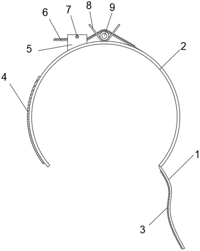 | 摘要: | 本实用新型属于医疗器具相关技术领域,具体涉及一种外周置入中心静脉导管固定套,其包括:套筒,所述套筒前后侧上端均固定有对连接导管进行架设的限位架,所述限位架一侧的套筒外壁固定有固定座,所述限位架的对向内壁开设有活动槽,所述活动槽和通槽之间套设有对连接导管进行限位的棘齿条,所述连接导管右端与套筒外壁固定连接,所述通槽的内部通过转轴转动连接有与棘齿条相配合的棘爪,通过将棘齿条活动端穿过活动槽并伸入到固定座内部的通槽中,此时,在复位弹簧良好的弹性性能下,复位弹簧能够对棘爪施加一个逆时针旋转的力,使得棘爪能够与棘齿条相啮合,避免棘齿条发生回拉,通过棘齿条能够简单快速的对连接试管进行限位固定。 | ||||