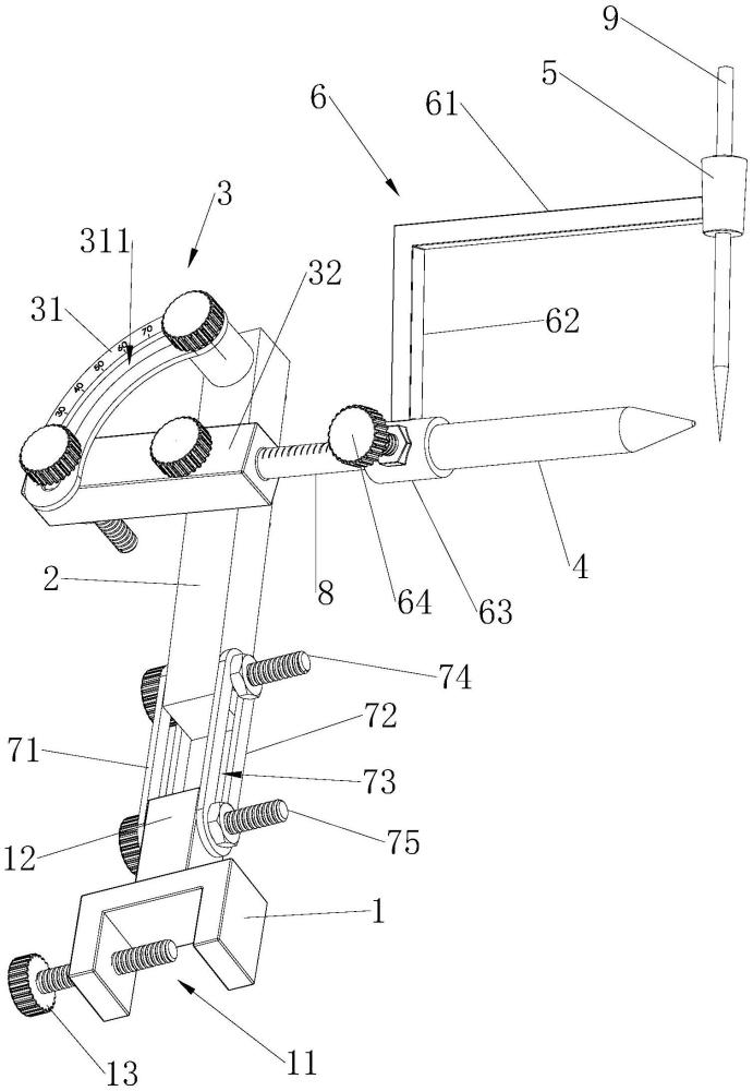 | 摘要: | 本实用新型公开了一种骶髂骨后方螺钉置入导向装置,包括连接座、固定杆、角度调节器、定位杆、导向筒和连接件,固定座与骶髂骨后方可拆卸地固定连接,导向筒可供导针穿过,固定杆一端与连接座滑动连接,另一端与定位杆转动连接,角度调节器设置于固定杆与定位杆之间并用于调整两者之间的夹角,连接件一端与定位杆转动连接,另一端与导向筒连接,导向筒与定位杆的轴线始终垂直,连接件可绕定位杆的轴线转动,导向筒同步转动;固定杆与定位杆之间设有用于调整定位杆与固定杆之间间距的伸缩杆。通过上述定位调整,可使导针精准得经过定位点,还使得螺钉置入的定位步骤简单且耗时较短。 | ||||
