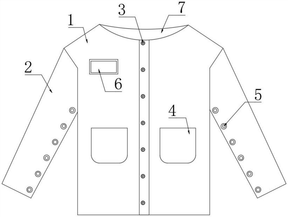 | 摘要: | 本实用新型公开了一种适于头颈部放疗患者的病服,包括上衣本体,所述上衣本体的左右两侧均安装有衣袖,所述上衣本体的上端设有衣领口,所述衣领口为弧状开口,所述衣领口的前侧开口位于人体锁骨处下端的3cm至6cm之间,所述衣领口的后侧距离人体颈部处下端的2cm至5cm之间。该装置通过设置较大的衣领口以及辅助开口,有效的防止因衣领摩擦导致皮肤破损,加重感染,保护放射野皮肤,同时还设有第一固定扣和第二固定扣,能够根据需求,暴露出手臂皮肤和后背皮肤,提高了装置的实用性。 | ||||