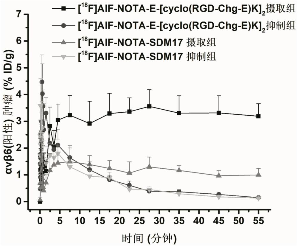 | 摘要: | 本发明属于制药技术领域,特别涉及一种PET显像剂前体、PET显像剂及其制备方法和应用。本发明PET显像剂前体的结构式为: 其中,M为螯合基团。本发明的PET显像剂前体具有两个环肽单元,并经一个谷氨酸链接螯合基团,二聚体分子中的两个结合序列距离足够长使其能同时与细胞表面表达的整合素受体αvβ6结合,可增强结合亲和力及肿瘤对药物的摄取,其所制备的PET显像剂具有良好的靶区与非靶区比值、较低的正常组织摄取和肿瘤高摄取,可靶向特异性摄取于肿瘤部位,更有利于αvβ6阳性疾病的PET显像。 | ||||