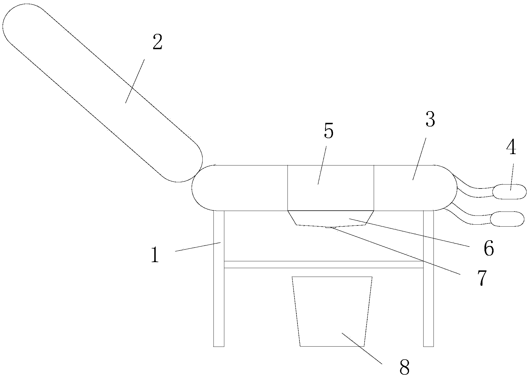 | 摘要: | 本实用新型的一种女性留取中段尿的诊断床,包括床体,在所述的床体上依次设有靠背板和坐板,在所述的坐板外端对称设有脚板,其中,在所述坐板上设有留尿孔,在所述的留尿孔中设有承接盆,所述的承接盆上设有排水口,所述的排水口下方设置有一承接桶。女性使用本实用新型的女性留取中段尿的诊断床来留取中段尿,既能够方便患者,又方便护理人员准确留取中段尿标本。 | ||||