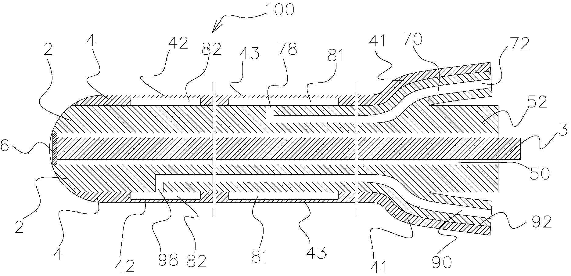 | 摘要: | 本实用新型公开了一种三腔二囊管,包括内管和外管,内管中空形成贯通其首末两端的胃管,该内管的管壁自其首端起,沿纵长方向设置有食管腔和胃腔,该食管腔和胃腔分别以通孔穿出该内管的外壁设置,所述外管套设在所述内管的外壁上,且外管在对应所述内管管壁上的两个通孔处,分别设置用于形成食管囊和胃囊的弹性膨胀部,还包括内导丝,所述内导丝设于所述胃管中。通过在胃管中设有内导丝,增加了内管的硬度,从而使得三腔二囊管具有较大的硬度,便于插置入患者体内,利于提高一次插管成功率。 | ||||