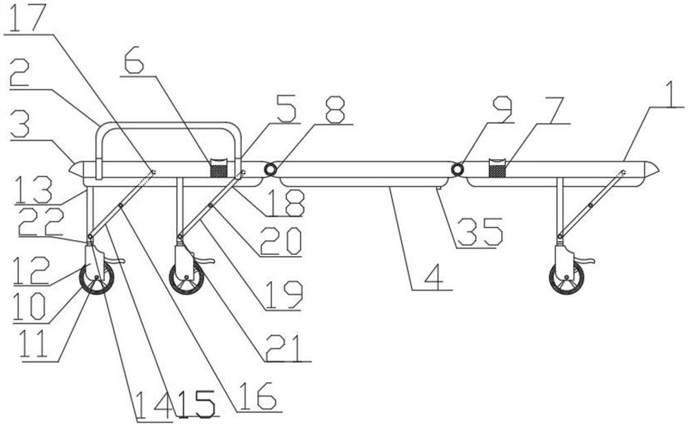 | 摘要: | 本实用新型提供了一种便携式可折叠转运架,属于医疗器具技术领域,包括车架、轮子和扶手,车架由第一段车架、第二段车架或第三段车架组成,第一段车架、第二段车架和第三段车架通过固定转轴连接,第一段车架下方设有三只可行走轮,第三车架下方设置两只行走轮,行走轮上方连接支撑折叠机构,支撑折叠机构上方连接车架,第一段车架两侧设置可收放扶手,第一段车架和第三车架上分别安装安全带,并在车架下方设置气囊,本实用新型的优点在于多功能救生床可以在担架、推车和轮椅间根据需求转换,能够满足户外救生床运送过程中多种救援工具需求,通过设置气囊使救生床具备涉水功能,大大提升了救援效率。 | ||||