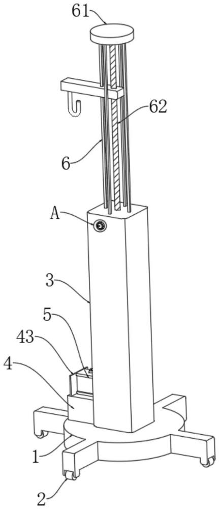 | 摘要: | 本实用新型公开了一种能够方便单手操作的输液架,包括轮架和底轮,轮架的顶部设置有支撑柱,轮架上位于支撑柱的侧面设置有支撑座,支撑座上设置具有方便调节的夹持组件,支撑座上设置有胸腔引流瓶,支撑柱的顶部设置有支撑杆,多个支撑杆的顶部设置有支撑块,支撑块与支撑柱之间设置有转动螺杆,转动螺杆上套接有移动固定架;本实用新型通过传动蜗杆的转动,加上蜗轮和转动螺杆的配合,使得移动固定架和输液挂钩沿着转动螺杆上下移动,进而调节输液瓶的高度,移动卡块与支撑弹簧之间形成弹性卡接结构,与卡槽之间配合,实现对转动螺杆的转动后固定,同时便于病房患者的单手操作,从而有利于输液架的使用效果。 | ||||