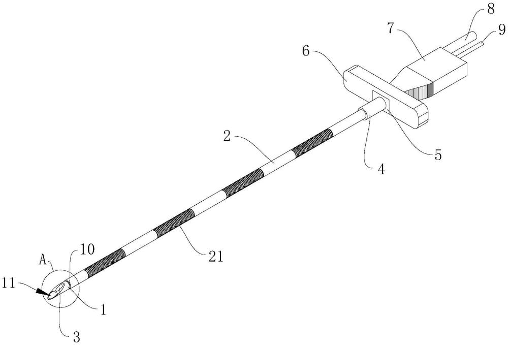| 摘要: | 本实用新型公开了一种穿刺手术器械装置。其中,包括:针体,所述针体外侧固设有针套,所述针体内部分别设置有注射孔与激光光纤,所述针体的一端裸露于所述针套外部,另一端可拆卸地固设有光纤接头模块;所述针体外侧与产生电流的设备电连接,所述激光光纤与所述光纤接头模块电连接;通过针体对目标组织电刺激,定位神经组织和精确寻找诱发肿瘤痛的靶点组织,寻找到靶目标组织后,经安装孔置入激光光纤对靶目标组织进行激光消融,最后,需要对目标组织进行药物注射和水分离松解时,可通过注射孔将药液输送至目标组织;避免反复穿刺损伤和更换穿刺针等繁琐操作,缩短手术时间的同时能减少手术操作引起肿瘤转移的可能,最大限度保护原有神经。 | ||||