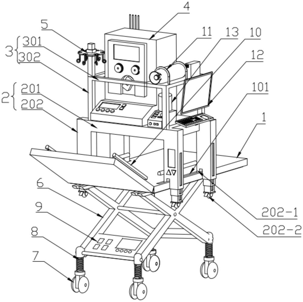 | 摘要: | 本实用新型公开了一种多功能一体化转运车,包括转运车主体和安装在转运车主体上方的固定框架,所述固定框架包括安装板以及设在安装板底部的伸缩式支撑柱,所述安装板上设有ECMO设备;当伸缩式支撑柱处于第一状态时,所述伸缩式支撑柱处于缩短状态,此时伸缩式支撑柱支撑在转运车主体上,固定框架与转运车主体之间通过连接件可拆卸式的连接,安装板与转运车主体之间的高度至少能够容纳病人平躺在转运车主体上;当伸缩式支撑柱处于第二状态时,此时伸缩式支撑柱处于伸长状态,所述伸缩式支撑柱的底部支撑在地面上,固定框架与转运车主体之间分离。本申请的多功能一体化转运车,能够实现转运车与ECMO设备快速拆装,为重症患者转运提供保障。 | ||||