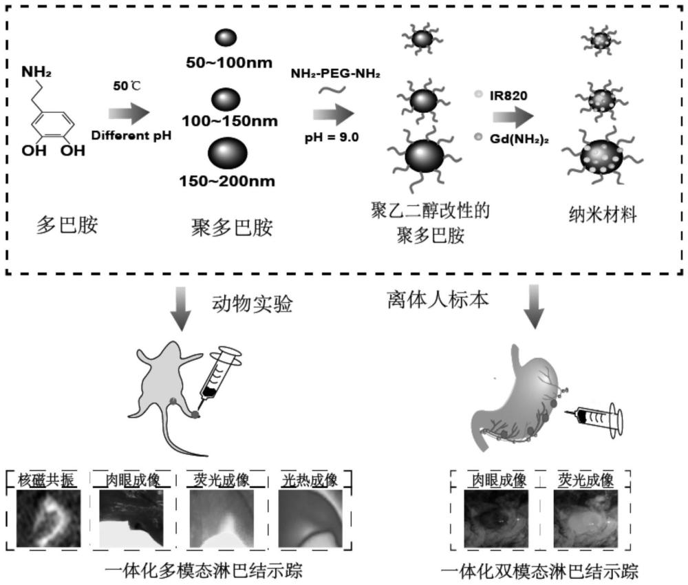| 摘要: | 本发明属于医药材料技术领域,公开了一种纳米材料及其制备方法和应用。该纳米材料,包括聚合物改性的聚多巴胺,和负载于聚合物改性的聚多巴胺上的染料和造影剂;聚合物选自双氨基聚乙二醇、聚乙烯亚胺、带巯基的聚乙二醇或透明质酸中的一种。本发明提供的纳米材料能够与淋巴特异性结合,能够作为淋巴示踪剂在手术中获得实时的肉眼/荧光/热信号的淋巴结成像,实现了术前/术中淋巴结示踪,实现淋巴结精准、高效切除。本发明能够制备出不同粒径大小的纳米材料,能够提供灵活多变的术前、术中注射时间点,以满足复杂和变化的临床需求。 | ||||