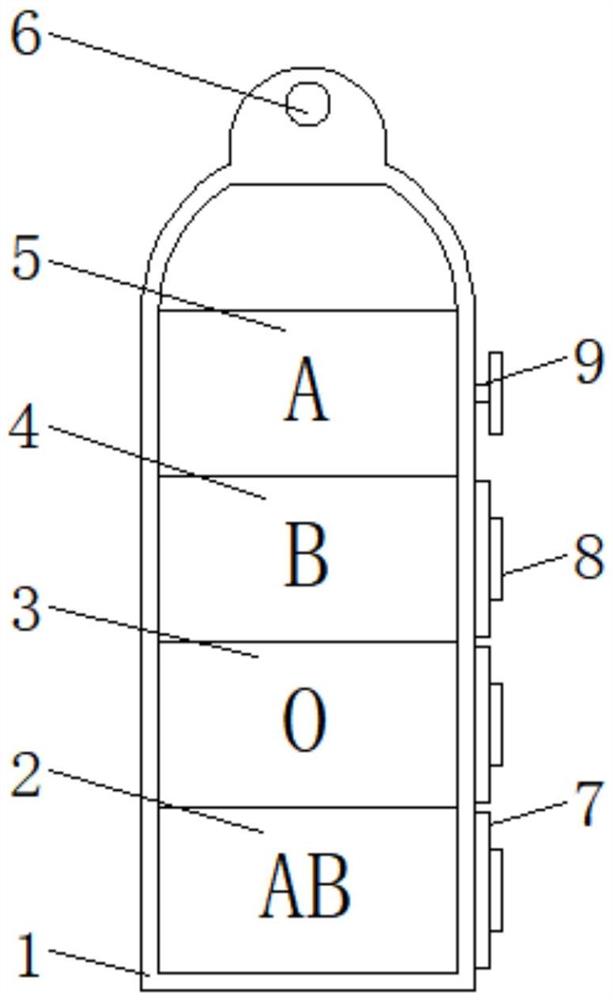 | 摘要: | 本实用新型公开了一种便捷血型标识牌,包括牌体,所述牌体正表面的顶部贯穿开设有悬挂孔,所述牌体右侧的表面从下至上依次设置有三个抽拉面板,所述牌体的正表面从上至下依次黏贴有A血型标签、B血型标签、O血型标签和AB血型标签。本实用新型通过设置牌体、AB血型标签、O血型标签、B血型标签、A血型标签、悬挂孔和抽拉面板的配合使用,可在更换患者时及时更换血型,这样血型标识牌的使用更加方便,解决了血型标识牌在使用过程中,因不能在更换患者时及时将血型信息进行更换,使得血型标识信息不清楚,不方便进行查对,从而导致血型标识牌出现使用不安全且不方便医护人员工作的问题。 | ||||