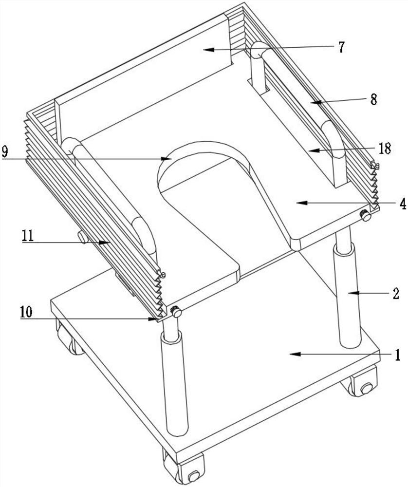| 摘要: | 本实用新型公开了医疗器械技术领域的一种移动升降坐便椅,包括移动底板,移动底板顶部固定连接有一组导向伸缩杆和调节支架,导向伸缩杆顶部固定连接有坐板,调节支架转动连接在坐板和移动底板之间,调节支架包括两组折叠臂,折叠臂转接处之间穿过有调节螺杆,坐板侧边滑动连接有靠背和扶手,调节螺杆与折叠臂转接处螺纹连接,坐板中间开设有排泄孔,坐板底部固定连接有延伸边,延伸边顶部固定连接有折叠波纹围片,折叠波纹围片端部固定连接有挂钩,坐板底部固定连接有放置框,本实用新型病人可直接挪动到坐板上,较为方便,且减少移动量,降低风险,保护病人隐私,避免尴尬,病人排泄物落在放置框内放置的承接盆内,方便后续处理。 | ||||