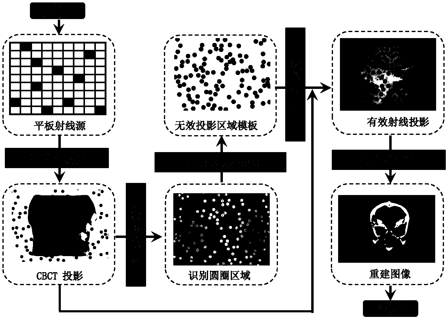| 摘要: | 一种基于平板射线源的随机射线成像方法,包括(1)设置处于关闭状态的射线源单元数量和产生射线的射线源单元数量;然后使用平板射线源随机产生射线分布,采集得到具有缺失数据的投影;(2)分割出投影中的黑色圆圈所代表的缺失数据;(3)生成一个黑色圆圈的模具并从中提取出每个圆圈的中心;(4)标定出原始投影中黑色圆圈的范围,生成无效投影区域模板,并且分离出有效射线投影;(5)利用有效射线投影,在最小二乘模型上加入一个全变差正则项,然后使用交替方向乘子算法求解最小二乘TV正则化模型,完成图像重建。本发明既能达到降低辐射剂量的目的,又能避免重建图像质量出现较大失真。 | ||||