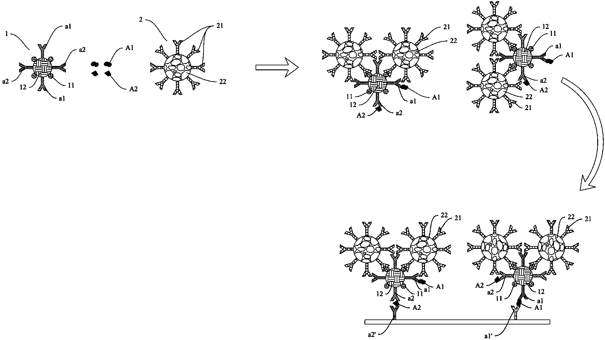 | 摘要: | 本发明公开了一种信号放大方法,其用于检测靶物质,包括:将具有能特异性结合不同靶物质的多种第一分子的偶联体与多种靶物质结合,偶联体还包括连接体、和与多种第一分子和连接体结合的第一颗粒;桥接体与偶联体的连接体结合,桥接体包括能特异性结合偶联体的连接体的第二分子;通过能特异性结合不同靶物质的多种第三分子分别捕获与桥接体结合后的偶联体上的多种靶物质。当桥接体的第二分子可与偶联体的第一分子结合,则偶联体上可不含有连接体。本发明还公开了使用该信号放大方法的相关装置。该同时检测多种靶物质的信号放大方法不但能够高灵敏检测靶物质,而且实现了多种靶物质的同时检测。 | ||||