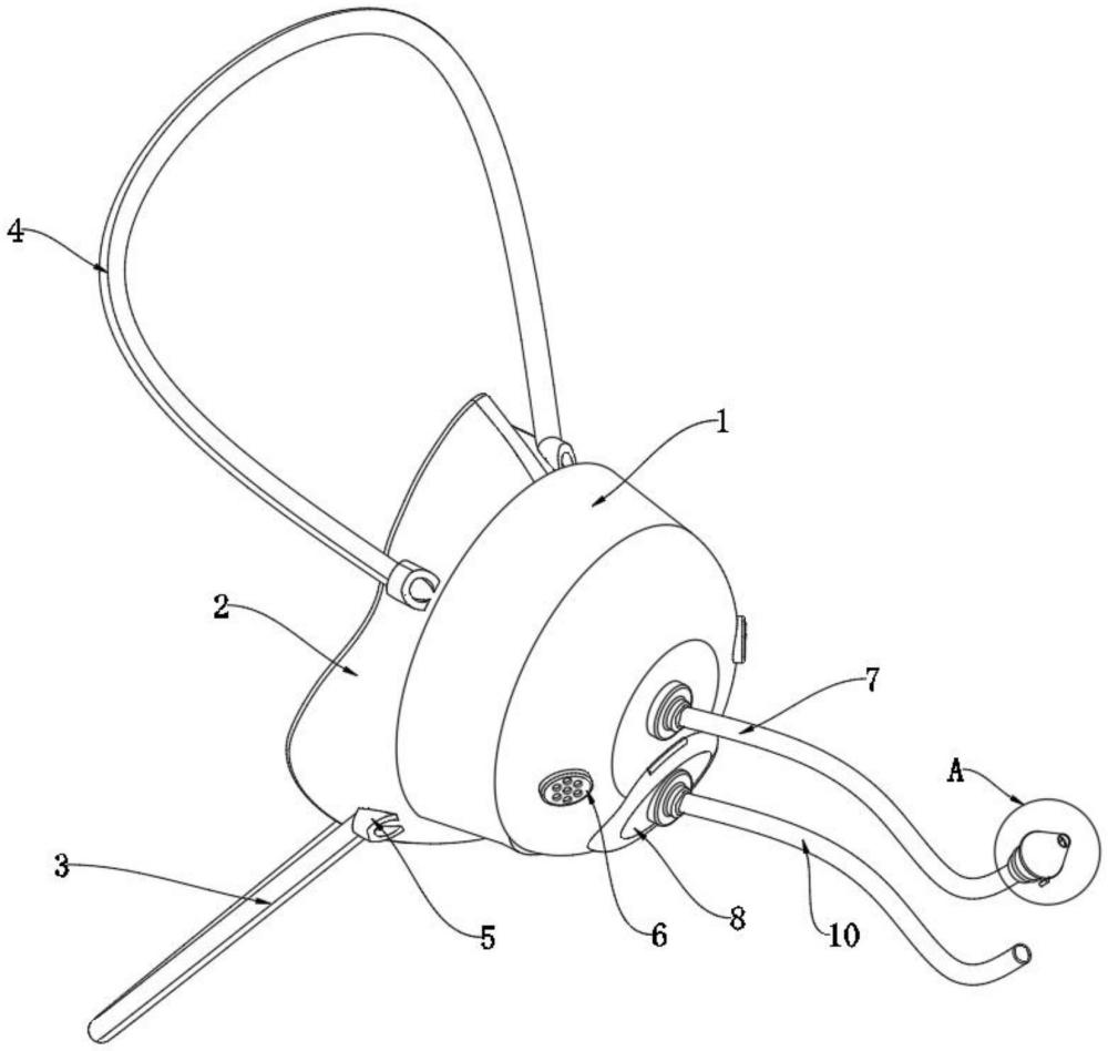 | 摘要: | 本实用新型公开了一种可插入鼻饲管的氧气面罩,具体涉及护理技术领域,包括面罩体,所述面罩体的外侧边缘部包裹有延伸部,所述延伸部的外侧边缘部与人脸曲线贴合,所述面罩体的外侧设置有固定组件,所述面罩体的外侧还设置有鼻饲组件和吸氧组件,所述鼻饲组件上设置有探测组件。所述延伸部的外侧边缘部采用气囊垫。所述固定组件包括下绑带和上绑带,所述下绑带和上绑带上下分布分别束于患者的头部耳上方和后颈部,所述下绑带和上绑带的两端均通过固定块设置在延伸部的外侧。本实用新型加设探测组件后的鼻饲管,方便操作者感知鼻饲液的温度,避免患者的黏膜组织受损且结构简单,具有实用性。 | ||||