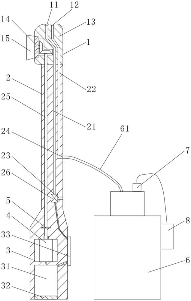 | 摘要: | 本实用新型公开了一种改良的冲吸式一体化牙刷。一种改良的冲吸式一体化牙刷,包括刷杆、设于刷杆一端的刷头和设于刷杆另一端的刷柄,其中,在所述刷杆内沿长度方向设有冲洗通道和吸引通道,所述冲洗通道的前端与一设于刷头前端的冲洗口连通,所述冲洗通道的后端与一设于刷杆侧壁上的进液口连通,所述进液口与外设注射器出液端连通,所述吸引通道的前端与一设于刷头前端的吸引口连通,所述吸引通道的后端与一设于刷杆侧壁上的出液口连通,所述出液口通过一吸引管与一负压吸引装置连通。本实用新型一种改良的冲吸式一体化牙刷,操作简便并且能够有效清理患者的口腔。 | ||||