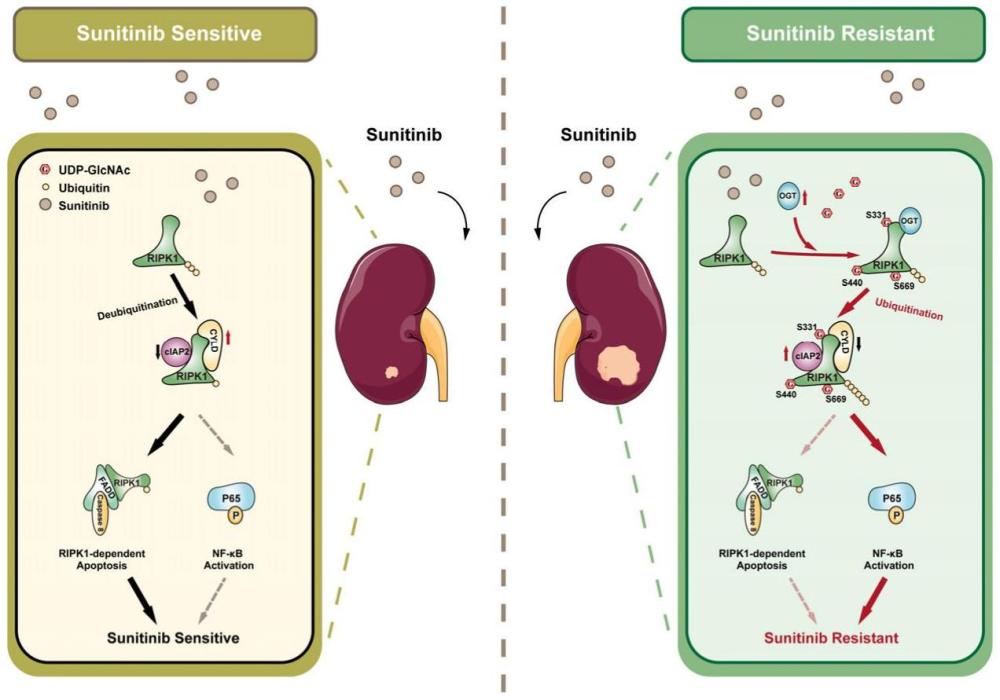 | 摘要: | 本申请提出一种RIPK1O‑GlcNAc糖基化抑制剂在制备增强舒尼替尼肾细胞癌敏感性药物中的应用,本申请发现RIPK1O‑GlcNAc糖基化特别是第331位、440位和669位丝氨酸的O‑GlcNAc糖基化降低了肾细胞癌对舒尼替尼的敏感性。因此通过抑制RIPK1O‑GlcNAc糖基化或者敲低O‑GlcNAc转移酶的表达,增加肾细胞癌对舒尼替尼的敏感性。因此RIPK1的O‑GlcNAc糖基化水平能够作为生物标记物,用于预测肾细胞癌对于舒尼替尼的敏感性;通过RIPK1O‑GlcNAc糖基化抑制剂来降低RIPK1O‑GlcNAc糖基化水平,特别是降低第331位、440位和669位丝氨酸的O‑GlcNAc糖基化,从而增加肾细胞癌对于舒尼替尼的敏感性,提高舒尼替尼的治疗效果。 | ||||