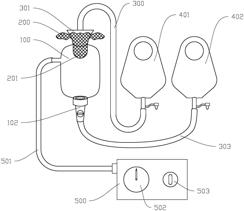 | 摘要: | 本实用新型公开了一种肠液回输装置,包括第一造口袋、第二造口袋、集液瓶和负压发生机构,集液瓶内设有过滤结构,集液瓶通过第一导管与第一造口袋连接,集液瓶的底部设有可启闭的出液口,出液口通过第二导管与第二造口袋连接;负压发生机构包括负压泵和第三导管,第三导管的一端连接在集液瓶的上部,第三导管的另一端与负压泵的接口连接。负压泵启动使集液瓶内处于负压状态,集液瓶收集来自第一造口袋的肠液,肠液经过过滤结构过滤后储存在集液瓶中,过滤结构使肠液的流动性更强,当需要回输肠液时,打开出液口,肠液及沿第二导管流向第二造口袋,从而回输到患者体内。使用本实用新型回输肠液,减少了患者自身肠液的丢失,有利于患者的术后恢复。 | ||||