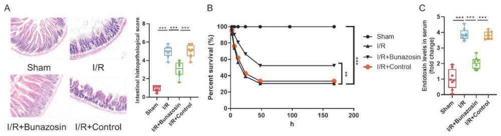 | 摘要: | 本发明属于生物技术领域,具体涉及盐酸布那唑嗪在防治肠缺血再灌注损伤中的应用。所述盐酸布那唑嗪为盐酸布那唑嗪溶液;所述盐酸布那唑嗪通过减轻肠缺血再灌注损伤、抑制肠外脏器的损伤、增加模型动物的生存时间、抑制缺血再灌注诱导的氧化应激、凋亡和促进上皮细胞增殖的方式防治肠缺血再灌注损伤。发明人经实验证实,布那唑嗪可有效减轻肠缺血再灌注损伤,同时抑制肠外脏器的损伤,明显增加模型动物的生存时间,抑制缺血再灌注诱导的氧化应激、凋亡和促进上皮细胞增殖的能力,为治疗肠缺血再灌注损伤的新药筛选提供了基础。 | ||||