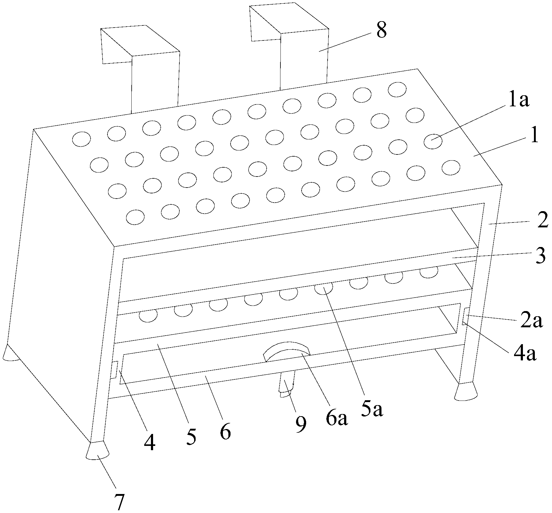 | 摘要: | 本实用新型公开了一种医用试管架,包括试管架主体,所述试管架主体包括一上横板和两竖板一,上横板上开有多个试管孔一,两竖板一垂直且一体连接在上横板的两端下侧,两竖板一的内侧面固定有位于上横板下方的上试管支撑板,在两竖板一的内侧面还装有滑轨,各滑轨上滑动安装有竖板二,两个竖板二的上端之间固定有下横板,两个竖板二的下端之间固定有位于下横板下方的下试管支撑板,下横板上开有多个试管孔二,两个竖板一的竖向高度高于两个竖板二的竖向高度,两个竖板一的下端固定有吸盘。本实用新型的医用试管架可固定在治疗车台面上,不易移动,避免标本摔碎。 | ||||