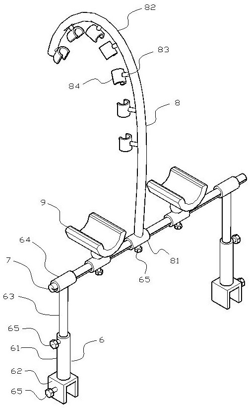 | 摘要: | 本实用新型涉及胸腔镜领域,尤其涉及一种胸腔镜目镜用冷光源线辅助支撑用具,该支撑用具可与床板两侧的固定板连接,可对冷光源线固定的同时,对工作人员的手臂起到支撑作用,降低工作人员的劳动强度。包括两侧的支撑件。第一套筒内表面固定设有矩形凸起,横杆上设有冷光源线支撑件,冷光源线支撑件包括滑动套在横杆上的第二套筒,第二套筒内端设有与矩形凹槽配合的矩形凸起,第二套筒底部向上旋拧有紧固螺栓,第二套筒顶面与可塑形的支杆底面固定连接,支杆内侧面间隔固定设有若干可塑形的支棒,支棒末端固定设有若干固定卡;冷光源线支撑件左右两侧的横杆上设有可左右移动和限位的手臂支撑件。它操作简单,使用方便,适用于手术床。 | ||||