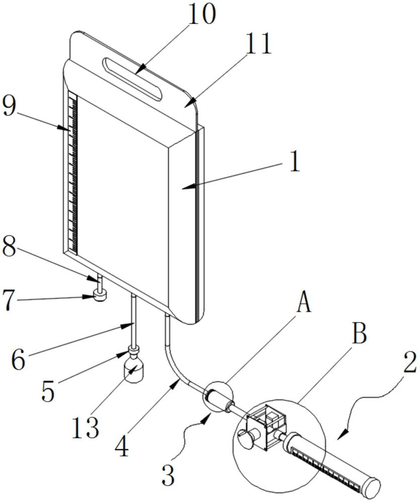 | 摘要: | 本实用新型公开了一种儿童用静脉营养置换液配置装置,包括配置袋,所述配置袋底部一侧安装有第一输液管,且第一输液管与配置袋内部连通,第一输液管一端安装有密封机构,本实用新型通过密闭排液机构的安装,通过将多余的药液排放到排液量筒中,排液量筒与配置袋上均安装有刻度尺,有利于根据儿童的用药量进行准确的排液,无需多次穿刺抽取,避免了交叉污染的情况出现,提升了设备使用的安全性,并且通过密封机构中的密封膜的安装,提升了配置液的密封,避免了泄露的情况出现,同时利用密闭排液机构中的活动密闭块和固定密闭块的压接固定,有利于保证了排液后的压紧密封,有效的避免了药液回流的情况出现。 | ||||
