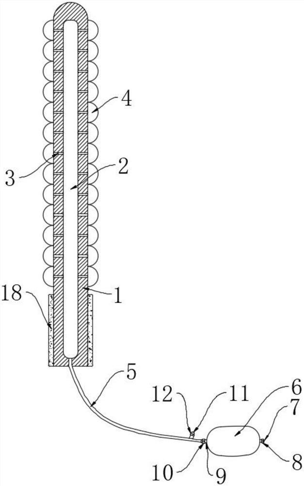 | 摘要: | 本实用新型公开了一种扩阴训练专用扩张器,包括加气棒,所述加气棒的内部设有通气腔,所述通气腔的外壁固定连接有多个气囊,所述加气棒上贯穿设有多个换气槽,每个所述换气槽均与通气腔相连通,每个所述换气槽分别与气囊相连通,所述加气棒上贯穿设有与其固定连接的第一连接管,所述第一连接管与通气腔相连通,所述第一连接管固定连接有出气口,所述出气口固定连接有手动加气球,所述手动加气球上固定连接有进气口,所述第一连接管上固定连接有放气口。本实用新型通过手动打气可以使患者根据治疗后的情况自己慢慢进行扩阴训练,操作简单;同时便于将药物注入到身体内,从而对患处进行治疗。 | ||||