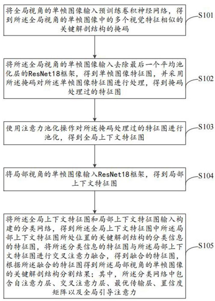 | 摘要: | 本发明涉及一种全局视角辅助下图像关键解剖结构分割方法、计算机设备和存储介质,包括将全局视角单帧图像输入卷积神经网络得到关键解剖结构的掩码;将全局视角单帧图像输入ResNet18框架得到单帧图像特征图,采用掩码处理单帧图像特征图得到掩码处理过的特征图;对掩码处理过的特征图进行池化得到全局上下文特征图;将局部视角单帧图像输入ResNet18框架得到局部上下文特征图;将全局上下文特征图和局部上下文特征图输入分类网络得到关键解剖结构的分类信息的特征图,将分类信息的特征图与局部上下文特征图交叉注意力融合得到融合的特征图,根据融合的特征图得到局部视角的单帧图像的关键解剖结构分割结果。上述方法能够提高关键解剖结构的分割准确度。 | ||||