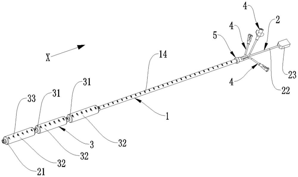 | 摘要: | 本实用新型涉及医疗器械技术领域,公开了一种可视扩张器,所述可视扩张器包括导管、内窥镜、扩张件和多个接口件;所述导管开设有第一安装孔和多个第一通道;所述内窥镜包括镜头部和连接部;所述扩张件包括连接管和球囊管,所述连接管的内壁和所述导管的外壁密封连接,所述球囊管的内壁和所述导管的外壁之间围合形成有扩张腔,所述球囊管的数量为多个,相邻两个所述球囊管之间通过所述连接管相连接;一个所述接口件通过一个所述第一通道和一个所述扩张腔相连通;本实用新型所提供的一种可视扩张器通过连接管、多个球囊管、多个第一通道和多个接口件,在使用时能够根据不同患者的不同情况对应调节扩张长度,匹配性较好。 | ||||