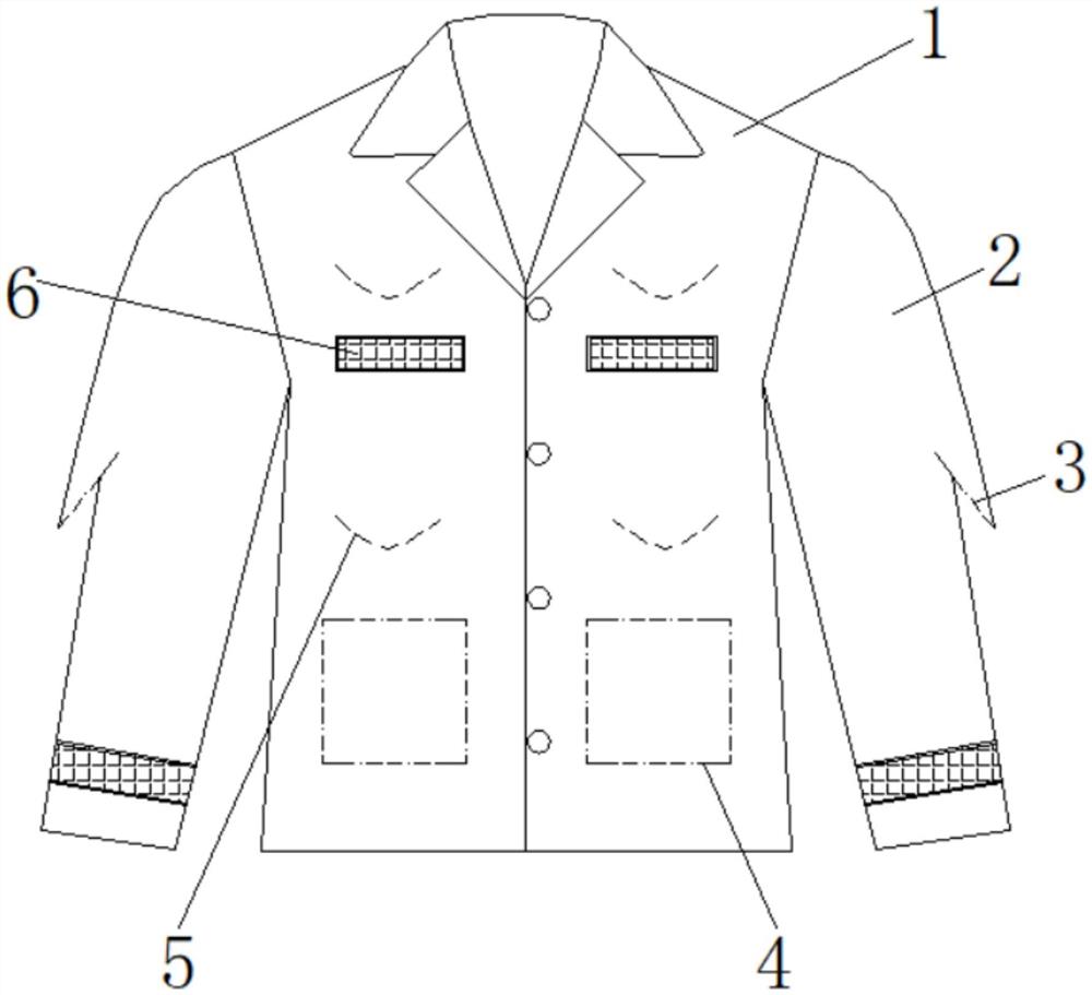 | 摘要: | 本实用新型公开了监测用病号服,包括衣服主体,衣服主体的两侧均固定连接有衣袖,两个衣袖相反的一侧均开设有第一开口,衣服主体内腔前侧的底部均固定连接有内口袋,衣服主体的正表面开设有第二开口。本实用新型通过设置衣服主体、衣袖、第一开口、内口袋、第二开口和反光结构的配合使用,解决了现有的监测用病号服不能使得用电器的导线从衣服内穿过,既不方便也不整洁,同时衣服内部没有设置口袋,不便于对随身的物品进行存储,容易造成物品遗失以及安全性较低的问题,该监测用病号服,具备便于用电器的导线从衣服内穿过,既方便又整洁,同时衣服内部设置口袋,可对随身的物品进行存储不易掉出遗失以及安全性高的优点。 | ||||