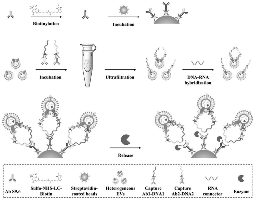 | 摘要: | 本发明公开了一种膜蛋白双阳性特异细胞外囊泡亚群分离富集方法、试剂盒及其应用。所述方法,包括如下步骤:将待处理的细胞外囊泡(EVs)样本、两个特异性靶向EVs膜蛋白标志物的抗体核酸复合物与能连接两个抗体核酸复合物的RNA连接链孵育,得到DNA‑RNA杂合体,实现EVs双阳性膜蛋白的捆绑;通过功能化磁珠特异性地捕获DNA‑RNA杂合体,实现膜蛋白双阳性特异EVs亚群的分离;通过酶切核酸链实现膜蛋白双阳性特异EVs亚群的富集。本发明提供的技术可实现膜蛋白双阳性特异EVs亚群无损分离富集,既能保证EVs数量,又能保证质量,还具有通用性,可根据实际需要更换抗体或靶向膜表面分子的识别原件实现双靶标阳性EVs亚群无损分离富集。 | ||||